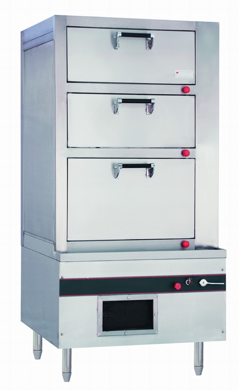 蒸柜炉由上柜体及下炉胆支架组成,上体采用全不锈钢组成 ,分为三层,上面两层每层内含不锈钢层网一件,下面一层含不锈钢层网两件,每格上有不锈钢掩门,门框上采用优质、卫生无毒及耐高温密封条,防止蒸汽泄漏,每一格设有独立安全泄汽阀开关,自动排出过压蒸汽。下支架用40×40×4mm角铁并加涂防锈漆,水胆为5mm厚黑铁板,外封不锈钢板,使炉身外观优美并坚固。