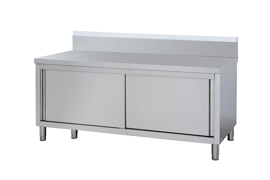 材质说明: 为满足卫生清洁要求板材采用优质拉丝不锈钢板,台面1.5mm厚不锈钢板,所有台面都用2.0 mm厚不锈钢板做加强筋,使其能承受≥1500kg/m²的平均载荷不变形;柜身及层板厚度为1.2mm;滑动拉门用1.2mm不锈钢作外壁,0.8mm不锈钢作内壁,门安装平式接引手柄,并采用双层式构造,中间填料,门厚12-15mm,趟门采用吊装式滑轨,使其不用工具就可以卸下,便于清理;脚通ф50X2.0mm不锈钢管,配不锈钢子弹脚4个,高度随意调节。